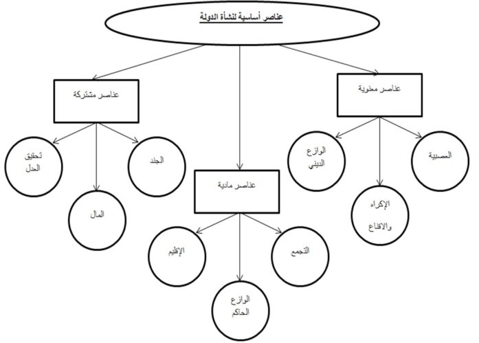 قسمت نظرية الدولة في الفكر الخلدوني منشأ الدولة إلى ثلاث عناصر أساسية: